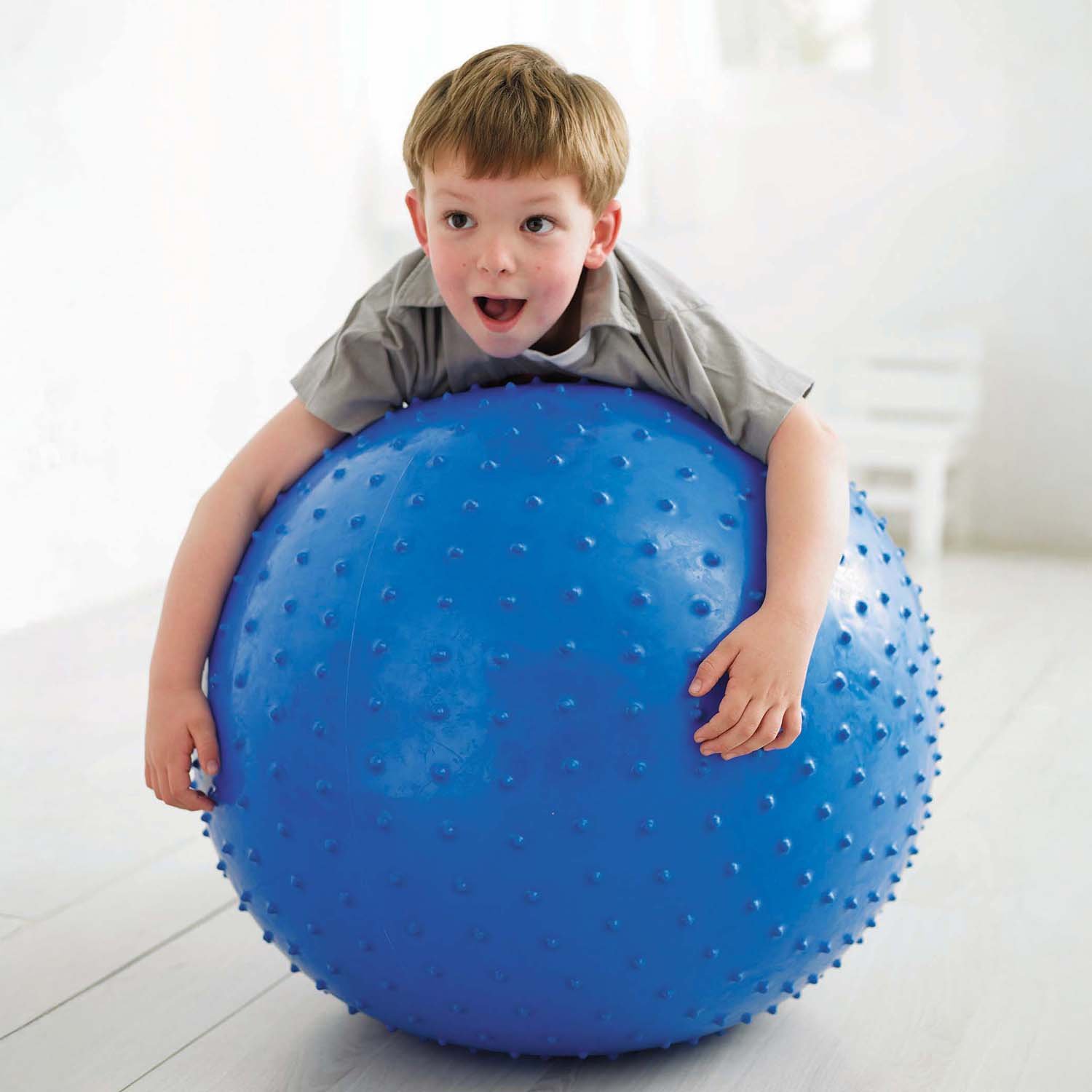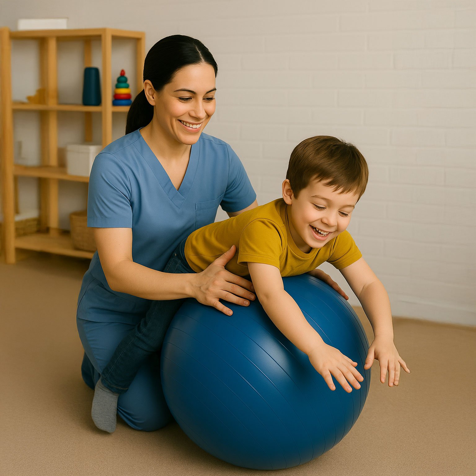 - The participant sits on the therapy ball while the helper sits in front of them.