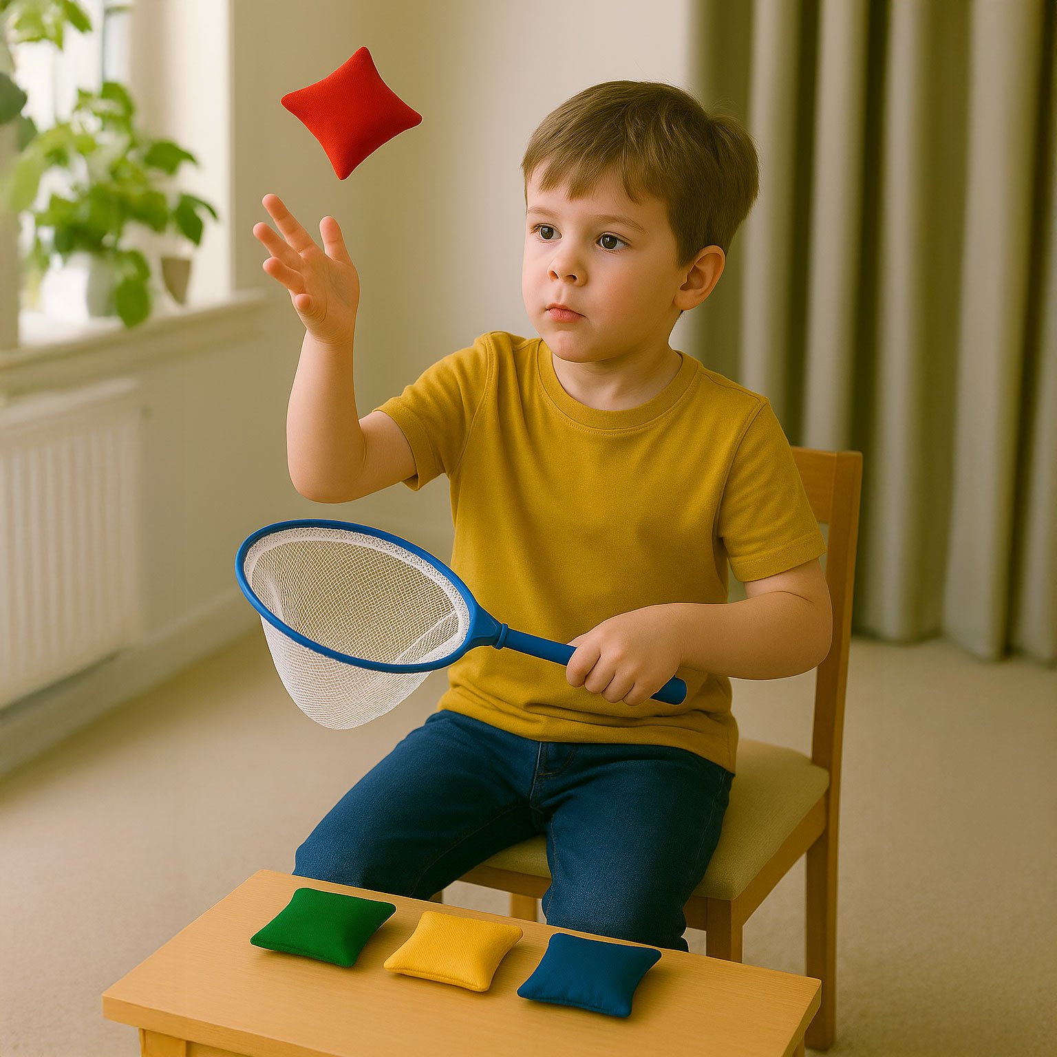 Provide the Child with a small racket and 2-3 bean bags of different colors.