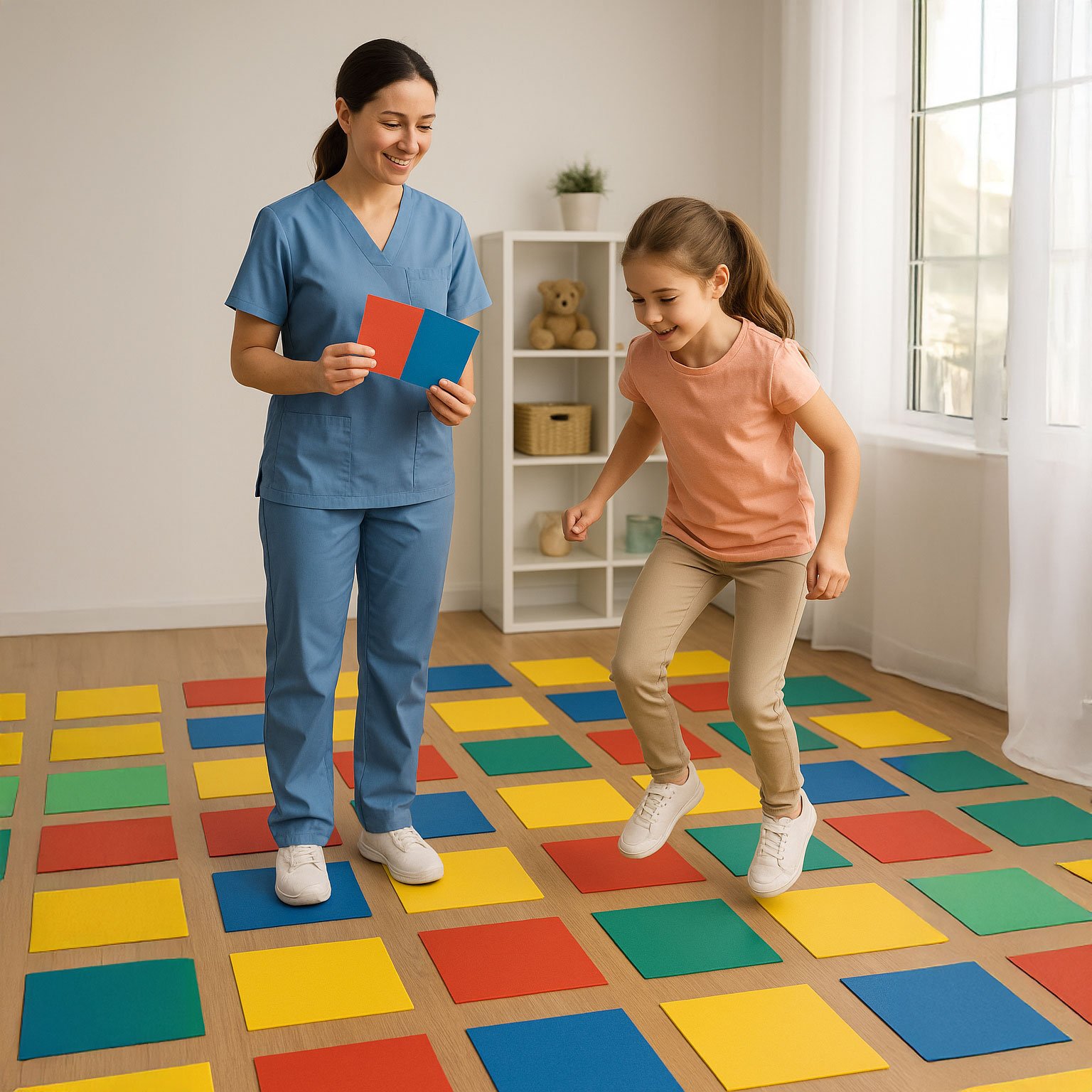 Arrange colored jump pads on the floor, spaced 2-4 inches apart.