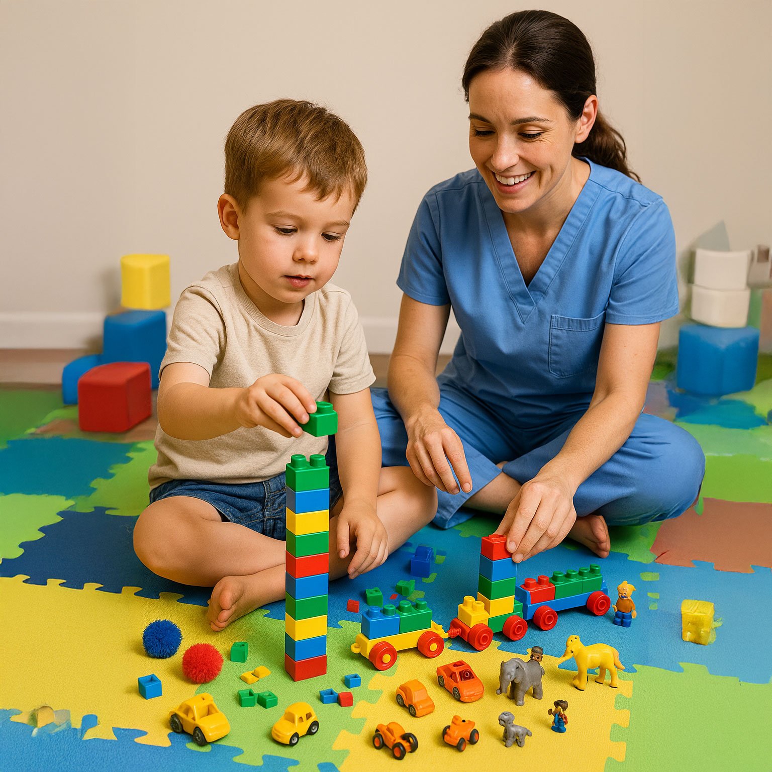 – The Child imitates the Helper, practicing stacking and moving blocks.
