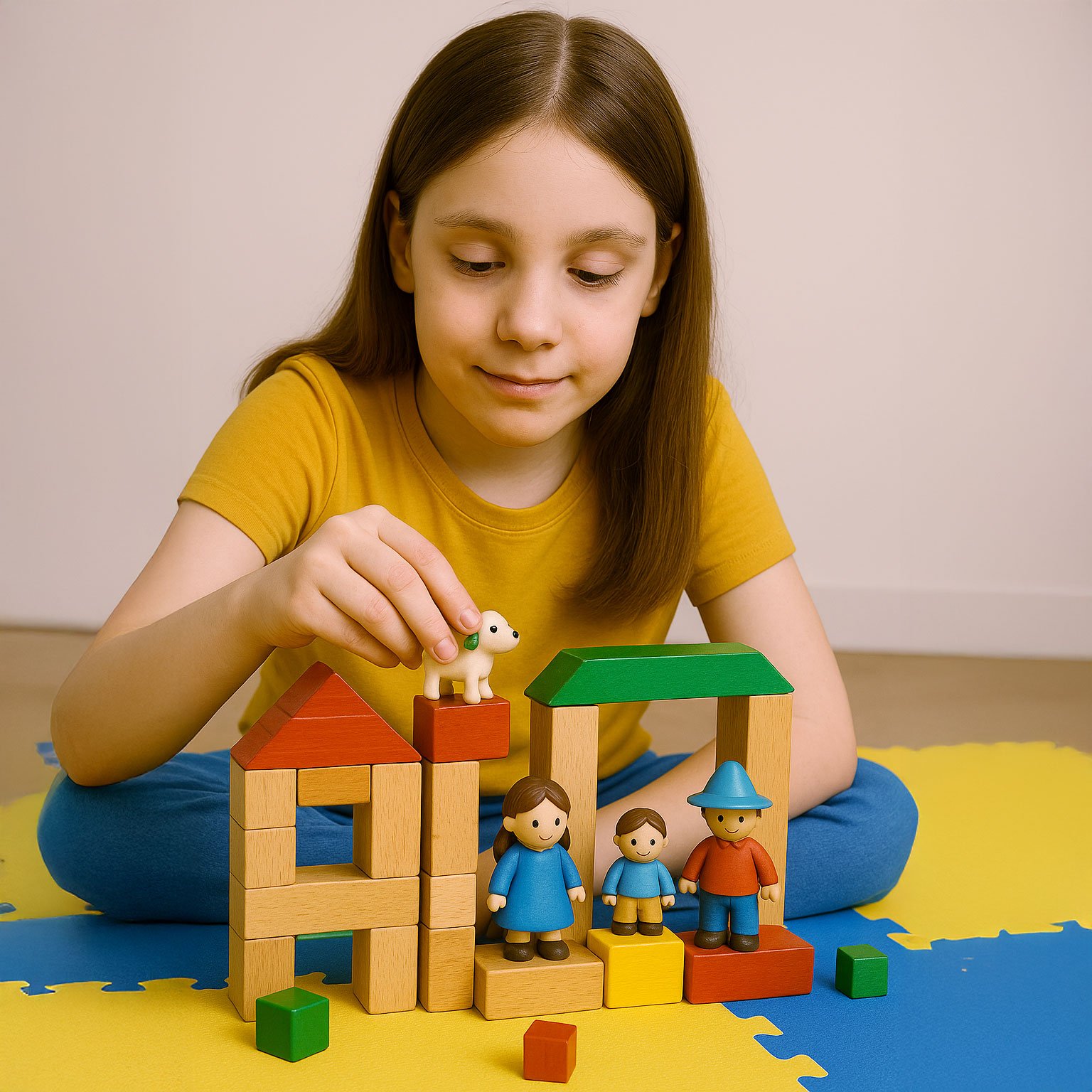 – The Child adds to the structure, inserting small plastic animals, play dolls, or figurines.
